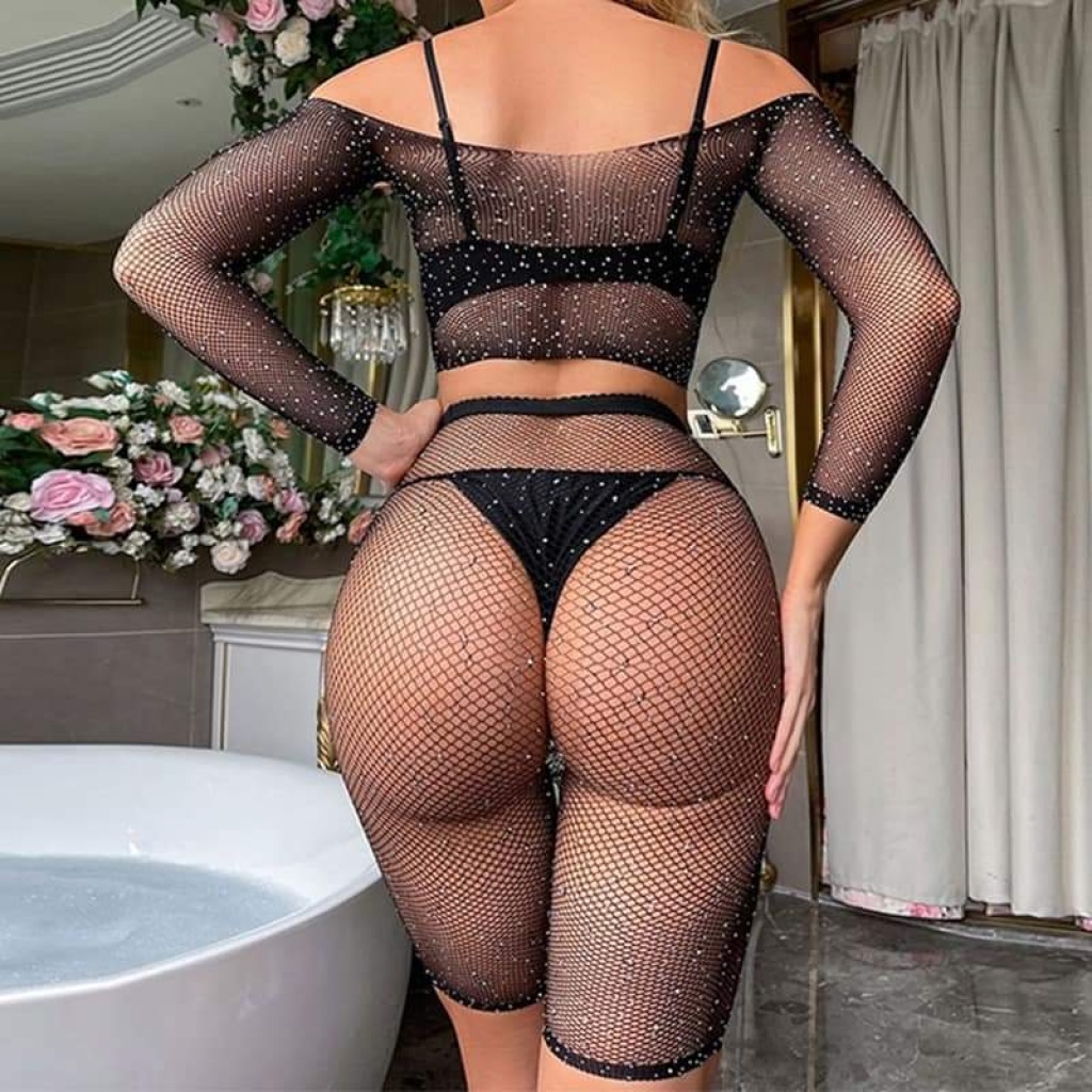 2 Parça Taşlı Omuzları Açık Crop- Şort Vücut Çorabı